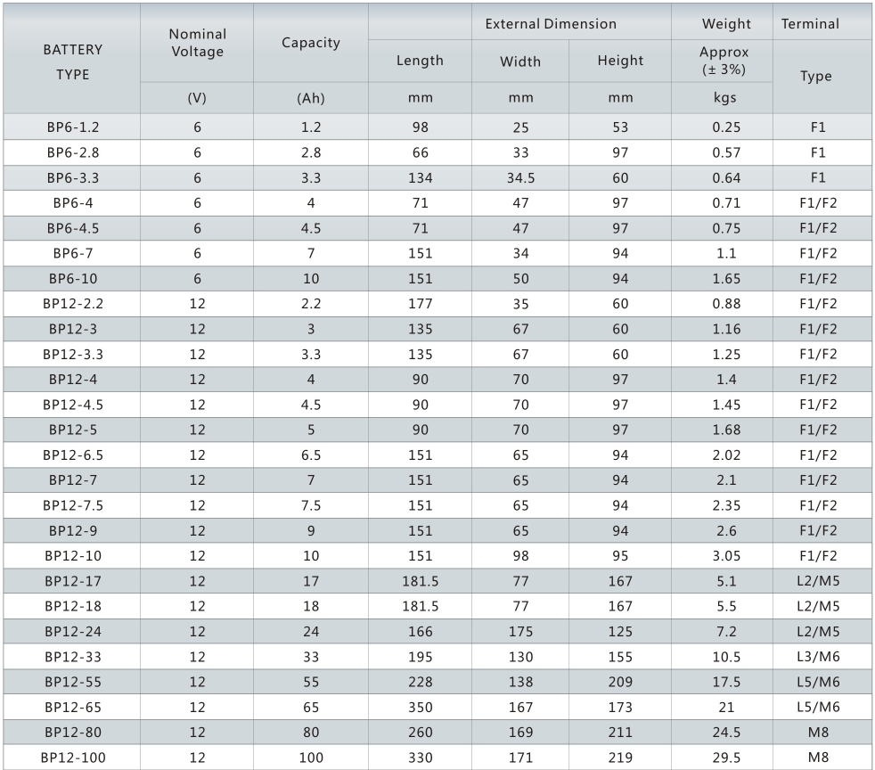 The BP MEDIUM series offers a 10 years full maintenance free design life. With a compact design and good reliability, this series is highly suited for security and alarm systems, UPS systems, emergency light systems and other small backup applications. The batteries comply to the most popular international standards, such as IEC896-2, BS6290-4, Eurobat Guide. The battery container and cover are available both in V0 class flame retardant ABS plastics.